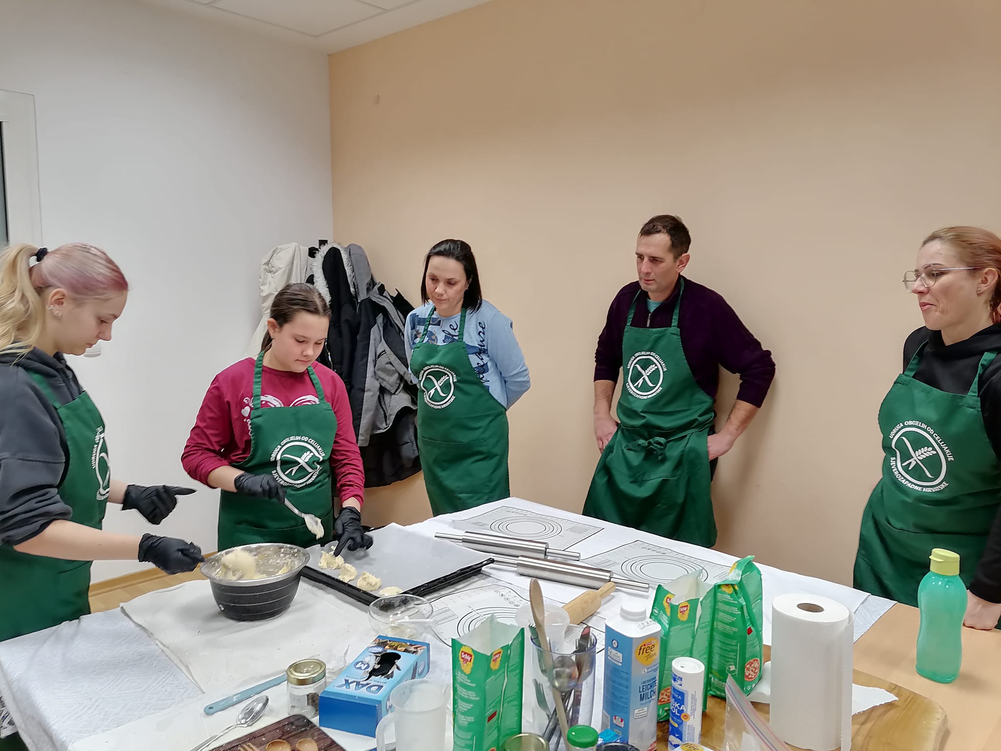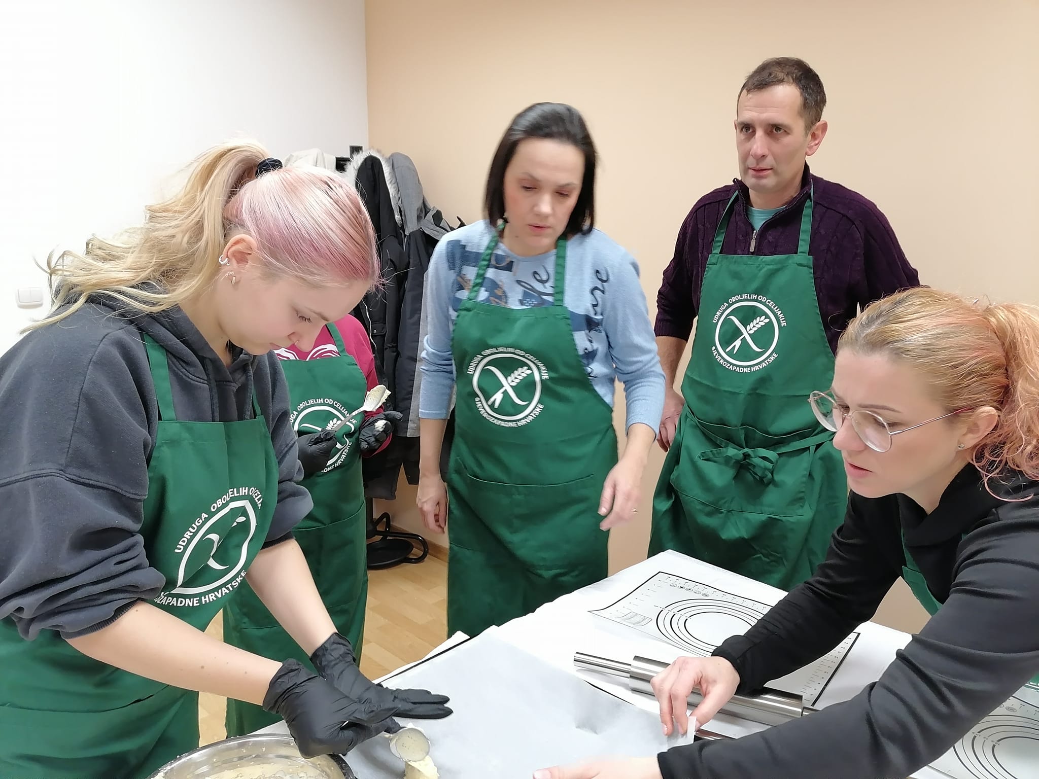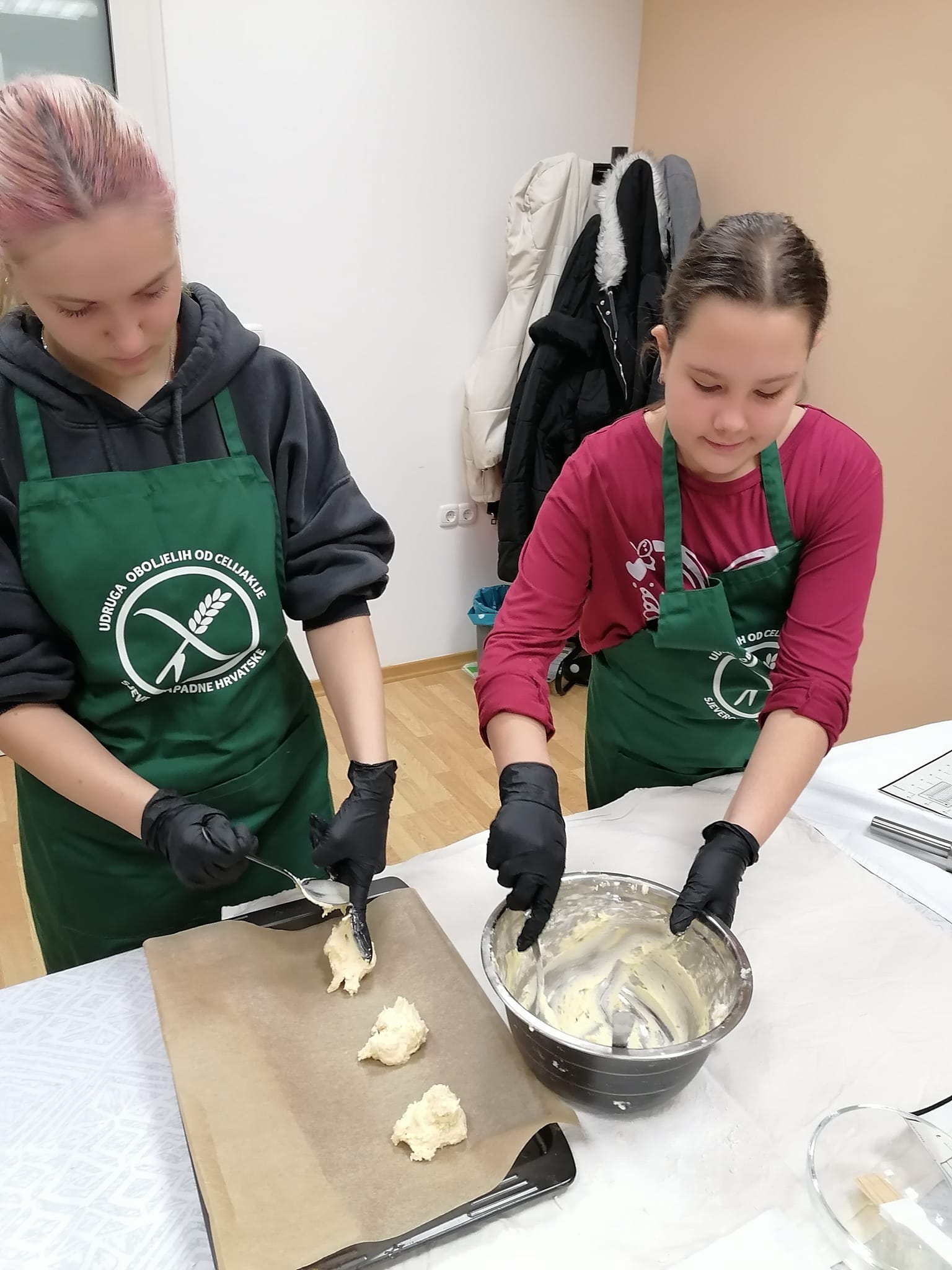 Na svakoj radionici, posebice za novoobeljele, želimo prikazati izradu bezglutenskog tijesta te ih uputiti da sami pripremaju svoje bezglutenske delicije. Ovaj put pripremali smo kruh u kalupu, brza peciva sa jogurtom, klipiće i male pizze bez glutena i laktoze. Za izradu smo koristili brašno Schär Mix B Bread po receptima iz knjižice “Dizana, vučena i prhka bezglutenska tijesta” .